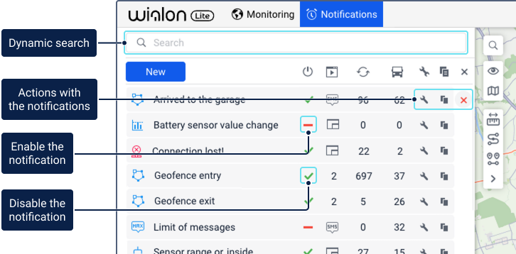 On the Notifications tab, you can see a list of all the available notifications. Above the list, there is the New button for creating notifications and a Search bar for dynamically finding notifications by different criteria. For details, see the Searching notifications page.
