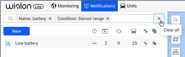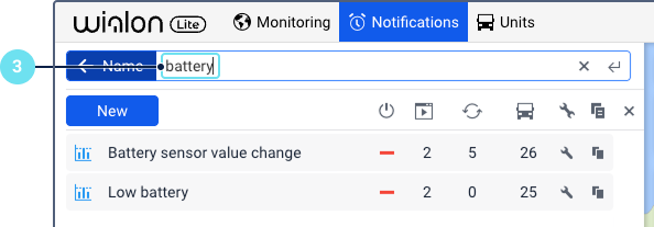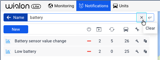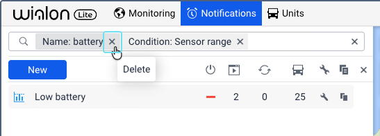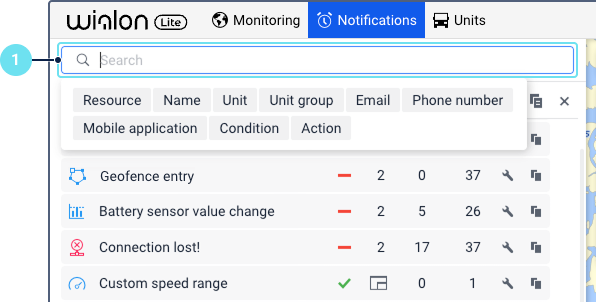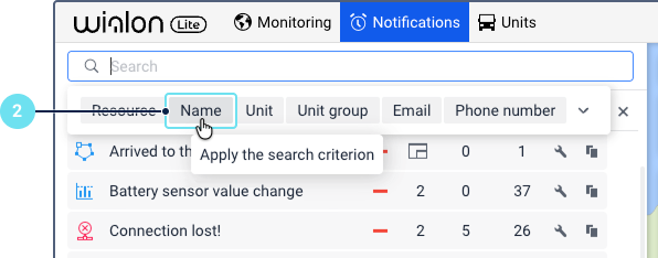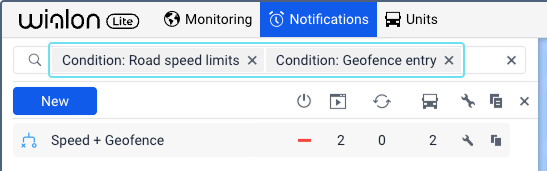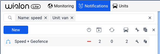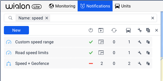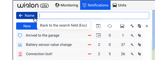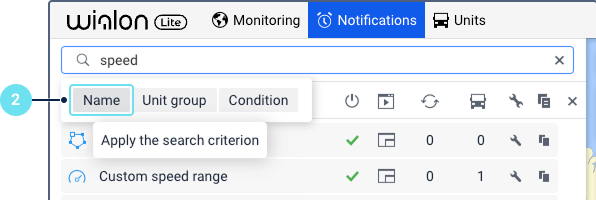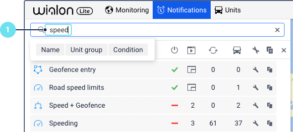 speedand you have notifications namedSpeeding, notifications with the Speed condition, and notifications created for the unit groupHigh-speed vehicles, you will see the Name, Condition, and Unit group criteria below the search field. -