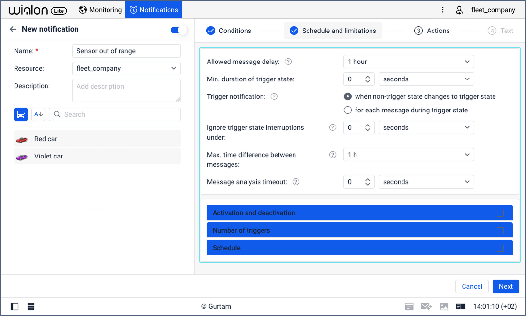 The system monitors state changes by comparing every unit message with the previous one. If the last received message contains a parameter value which matches the conditions for triggering the notification and the previous message contains one which doesn’t, the notification will be triggered. In the case of the Sensor value and Sensor range conditions, if the previous message doesn’t contain the required parameter or its value is invalid, the system analyses the 5 messages received before the last one. If there is a message with a valid value among them, it is used instead of the previous message.