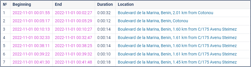 | Off-time | The time from the end of the previous stop to the beginning of the current one (to be defined beginning from the second stop). |