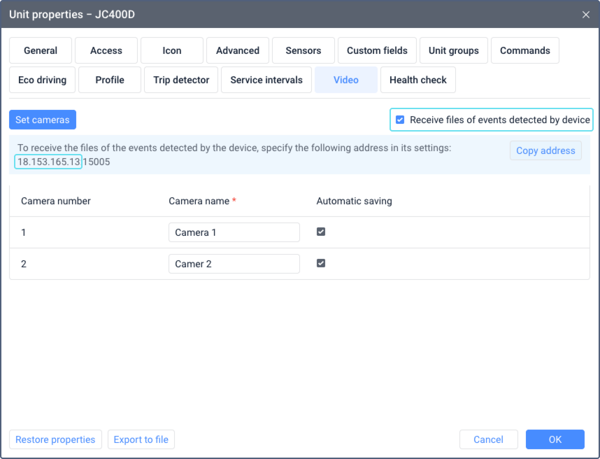 Additional device settings are available in the unit properties upon clicking on the icon next to the Device type field. For JC400 devices, no additional settings are required.