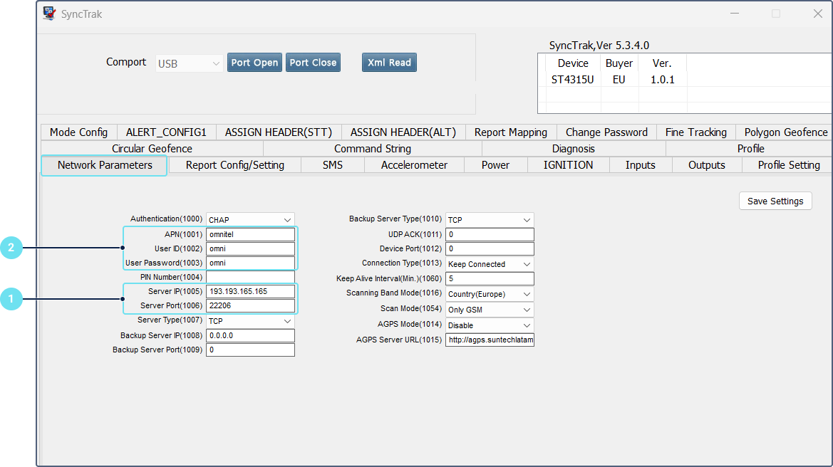 - On the Network parameters tab, fill in the Server IP(1005) and Server Port(1006) fields. Use the same IP address and port as in the unit properties in Wialon.