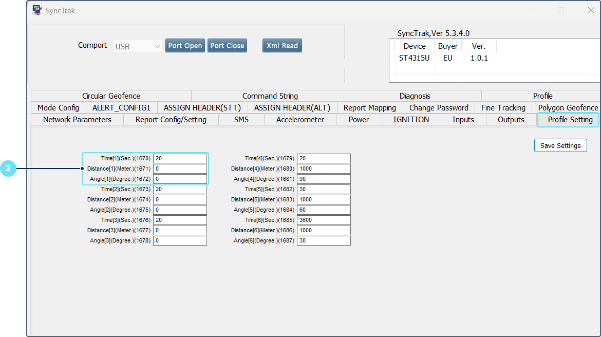- On the Profile setting tab, specify the sending period (time), distance and angle.