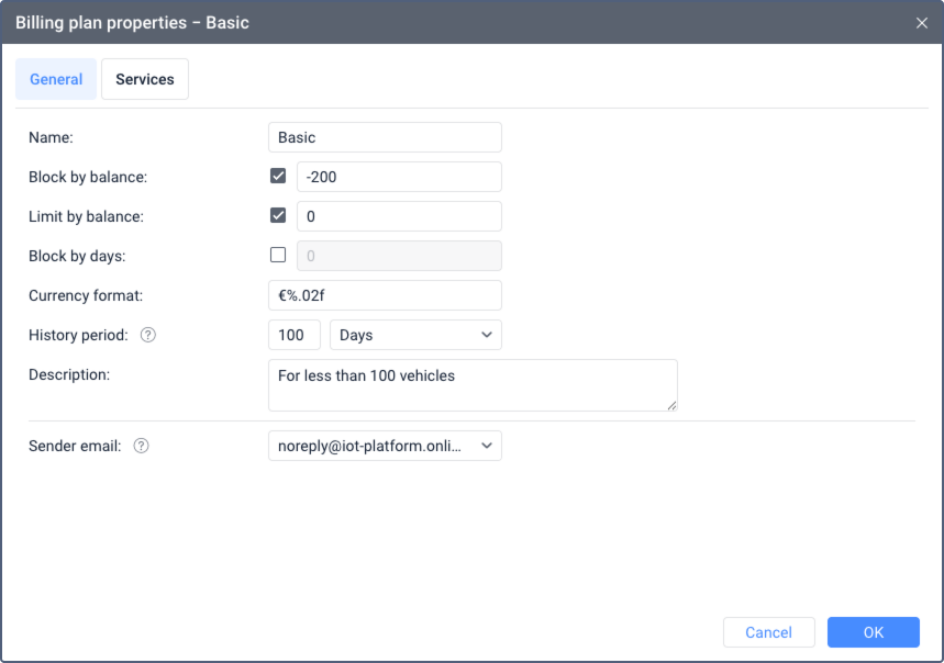| Limit by balance | The balance state at which some services and access to CMS Manager should be disabled for accounts with this billing plan. This option works similar to the same-name option in the account properties. |
