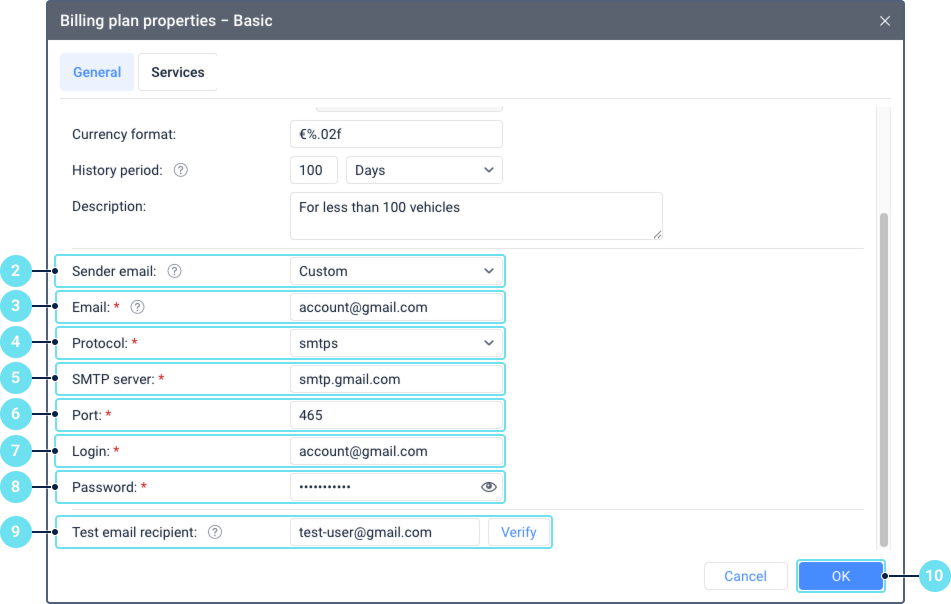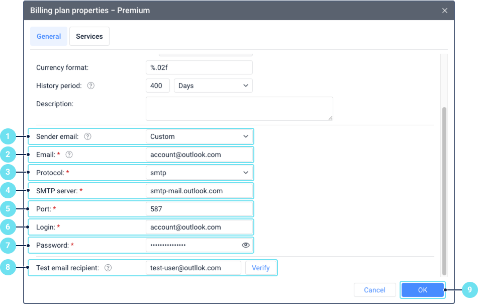 On the General tab, you can specify the basic settings of the billing plan related to the blocking of accounts, data storage and so on. You can specify some of these settings manually for each separate account. Also, here you can configure email parameters for sending various system messages (notifications, reports, and so on).