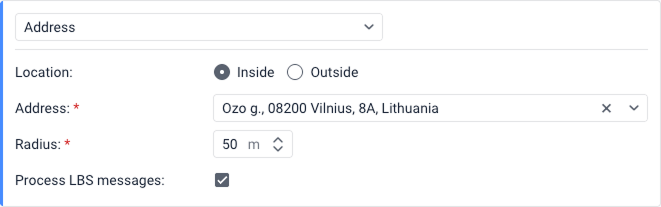 - Select when the condition should be triggered: when the unit is at the specified address (Inside) or in any other place (Outside).