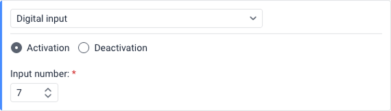 To configure this notification, specify the input number (from 1 to 32) for either the Activation or Deactivation option. You cannot select both options simultaneously within a single condition. If you need to monitor both the activation and deactivation of the same input, you must click Add condition to create a second condition with the opposite state.