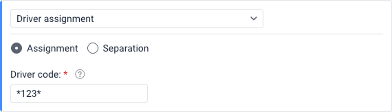 For both options, the Driver code field becomes available. Here, you can specify the driver code or its text mask to trigger the condition only when that specific driver is assigned or separated. You can enter several codes or code masks separated by commas without spaces. By default, an asterisk (*) is specified in this field, which means the condition applies to all drivers.