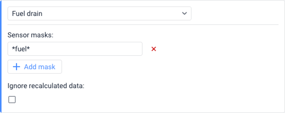 In the Sensor masks section, you can specify one or several masks of the sensors that should be used for detecting fuel drains and their volume. Click the Add mask button to add an input field for a new mask.