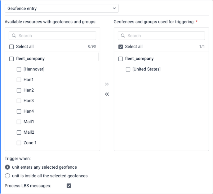 , move the items from the left list to the right one. - In case you select several geofences, select when to trigger: