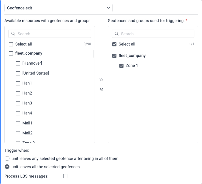 The notification is triggered when the unit leaves any of the selected geofences if it previously has been in all of them at the same time.