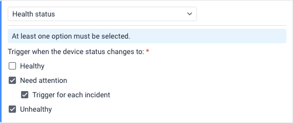 - Need attention: The condition is met when an incident that meets one or more criteria is registered for the unit device. Enable the Trigger notification for each incident option to generate a notification each time when an incident is registered within the Need attention status.