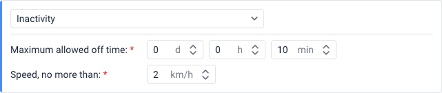 | Max allowed off time | Specify for how long a unit can remain stationary before the condition is triggered. This value can’t exceed 30 days. |