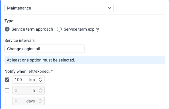 km), hours (h), and/ordaysshould be left (or should pass) for the condition to be triggered. At least one option must be selected.