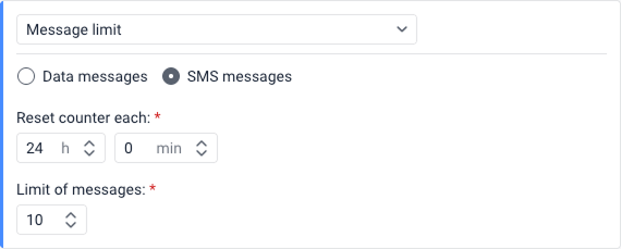 Example: In the example from the image above, the SMS messages option is selected. The Reset counter each field is set to 24 h, and the Limit of messages field is set to 10.