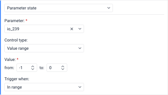 This condition is triggered when the system receives an alarm message from the unit. For this purpose, the device should support the function of sending such messages or a sensor of the Alarm type should be configured in the unit properties.