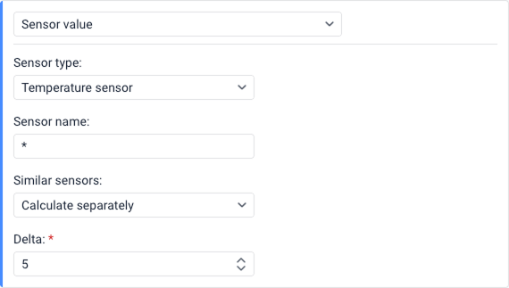 - In the Delta field, specify a threshold value. The notification will trigger when the absolute change between sensor values exceeds (is greater than) this threshold. The change is calculated using the absolute difference (modulo), which means the direction of change doesn’t matter: sensor values can increase or decrease. For example,