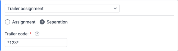 For both options, the Trailer code field becomes available. Here, you can specify the trailer code or its text mask to trigger the condition only when that specific trailer is assigned or separated. You can enter several codes or code masks separated by commas without spaces. By default, an asterisk (*) is specified in this field, which means the condition applies to all trailers.
