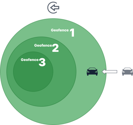 Example. Geofence 1, Geofence 2 and Geofence 3 are selected in the notification settings. Geofence 3 is inside Geofence 2 and Geofence 1. When the unit is in Geofence 3 and therefore in all the other geofences at the same time, the notification is triggered.