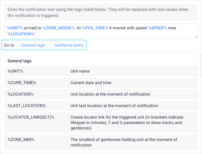 | Location and geofences | %LOCATION%, %LAST_LOCATION%, %LAT%, %LON%, %LATD%, %LOND%, %GOOGLE_LINK%, %LOCATOR_LINK%, %ZONES_ALL%, %ZONE_MIN% |