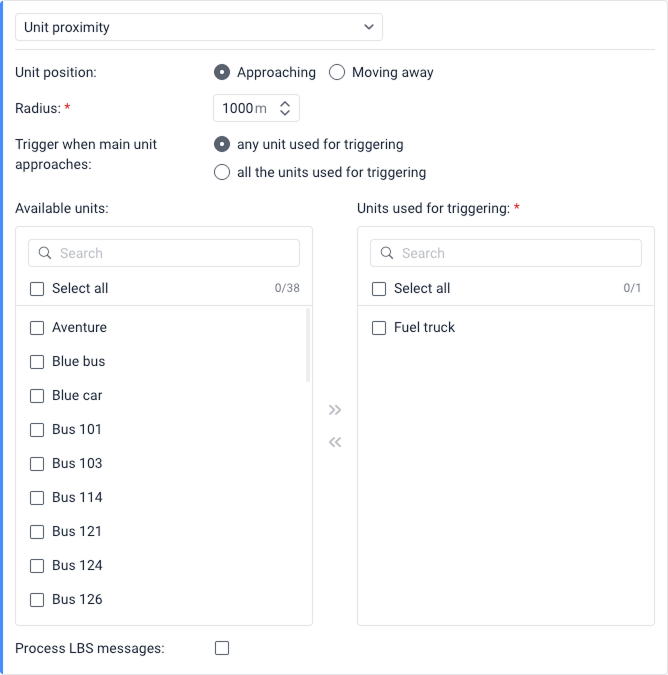 Select Process LBS messages if you want to use LBS data for triggering notification. LBS data are less accurate, but allow to determine a unit approximate location where GPS signals might be weak or absent. The GPS data still is used if available.