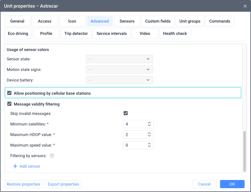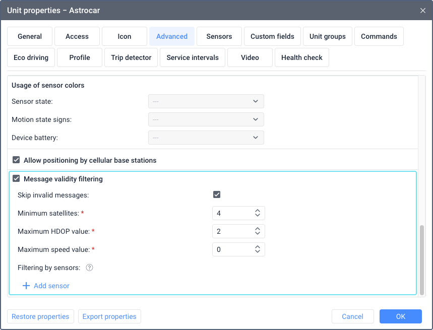 To solve this problem, Wialon provides message validity filtering. This feature allows you to specify the criteria that determine whether a message is valid or not. If a message is invalid, it is saved in the database without the information received from GPS: that is, without speed, coordinates, number of satellites, altitude, and movement direction. The other data from such a message (for example, sensor values) is saved and can be used in the system.