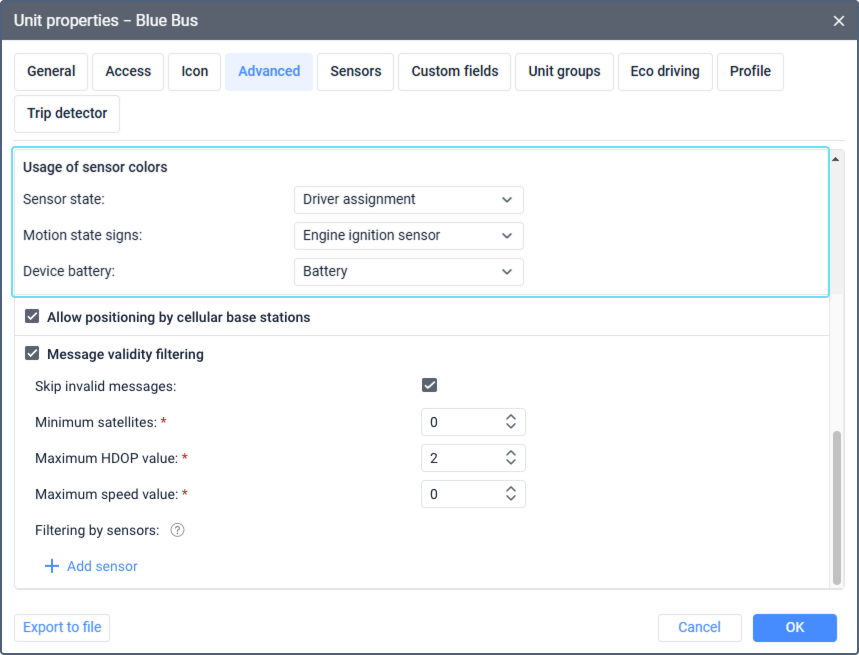 The Advanced tab consists of several sections. In these sections, you can configure parameters for reports, track and sensor colors, filtering of unit messages, etc.