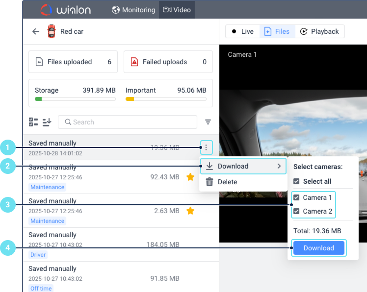 If the files are grouped, select the cameras from which you want to download them and click on the Download button. If the file couldn’t be loaded from any of the cameras, this camera is not available for selection.
