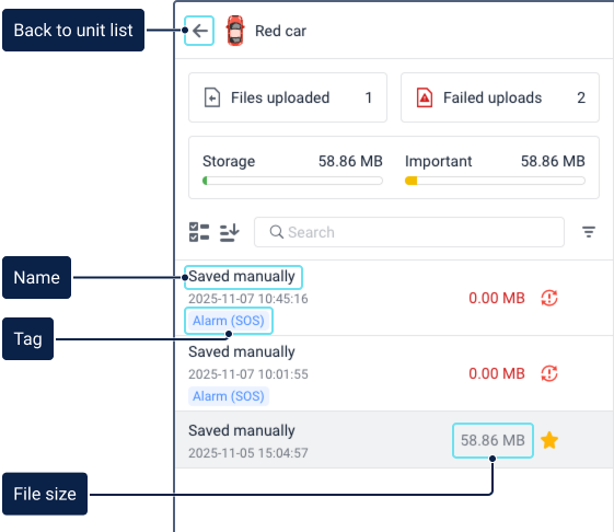 - Tag. The tag points to how the file has been saved. If a file has been saved manually, you can see the tag selected by the user when saving it. If a file has been saved by means of a notification, its tag is named after the type of the notification. If the file has been detected by device, the tag is Detected by device.