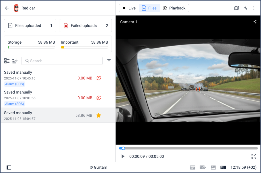 - Files uploaded: The total number of uploaded files or file groups (in case of multiple cameras) that are currently available in the storage.