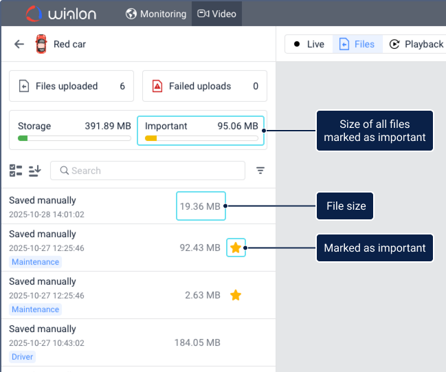 - Third-party servers (for example, SmartWitness Gateway or CMSV6 Gateway): The 30-day rule does not apply, as Wialon only stores links to these files.