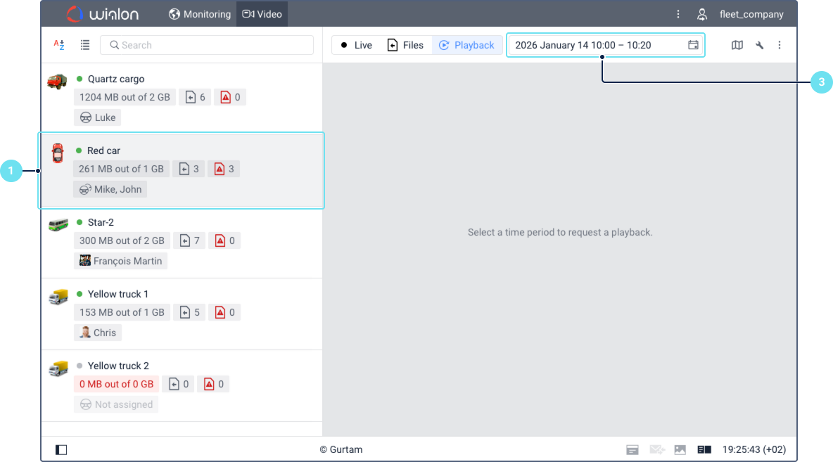 Select the unit from which you want to request the playback. The list shows units for which cameras are configured. The number of cameras is specified opposite the unit name.