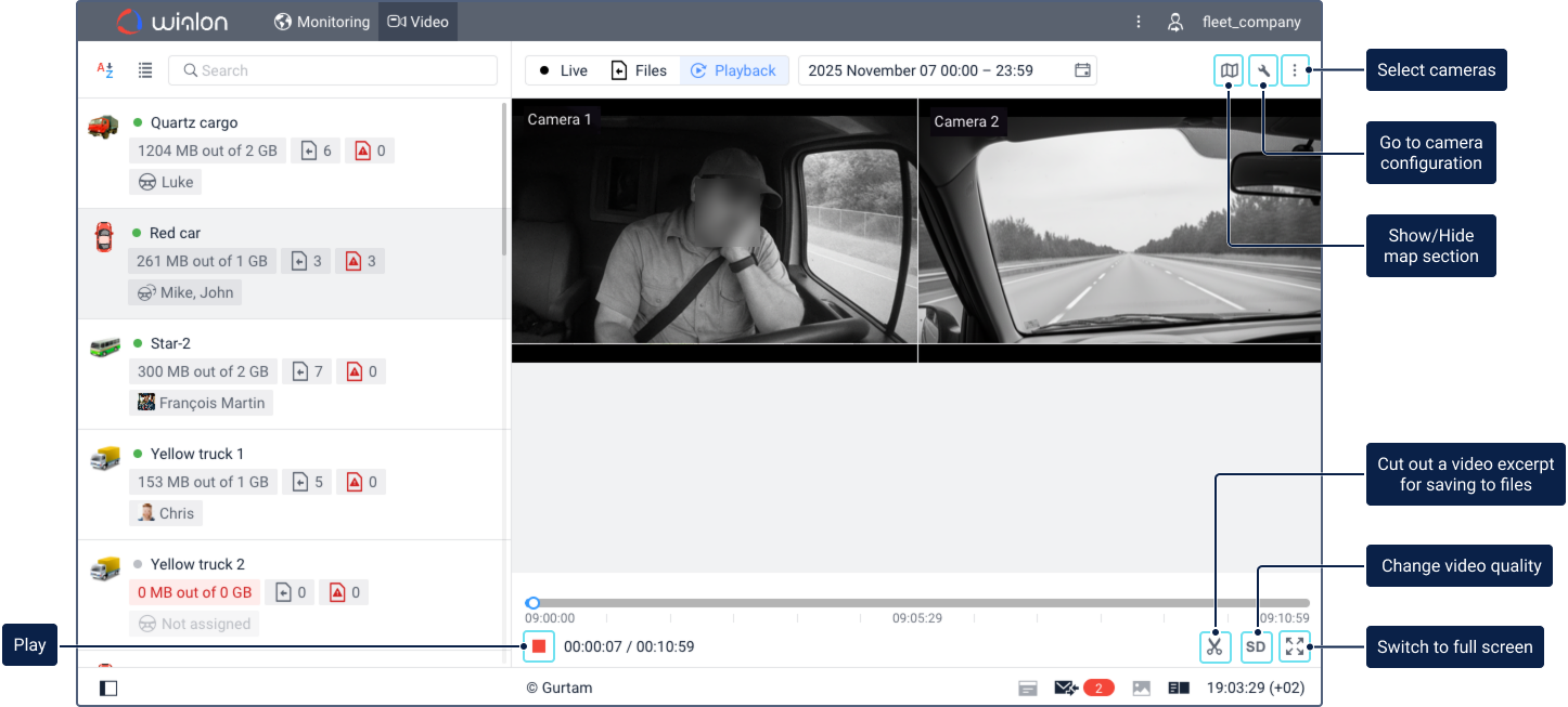 On this tab, you can receive videos for the past period (playbacks) from the unit cameras and save the required excerpts as files.