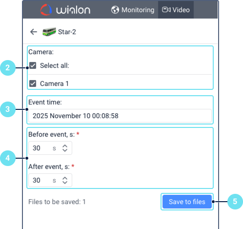 - Click on the Save to files button. The button is inactive if there is no data from any camera for all the interval you want to save.