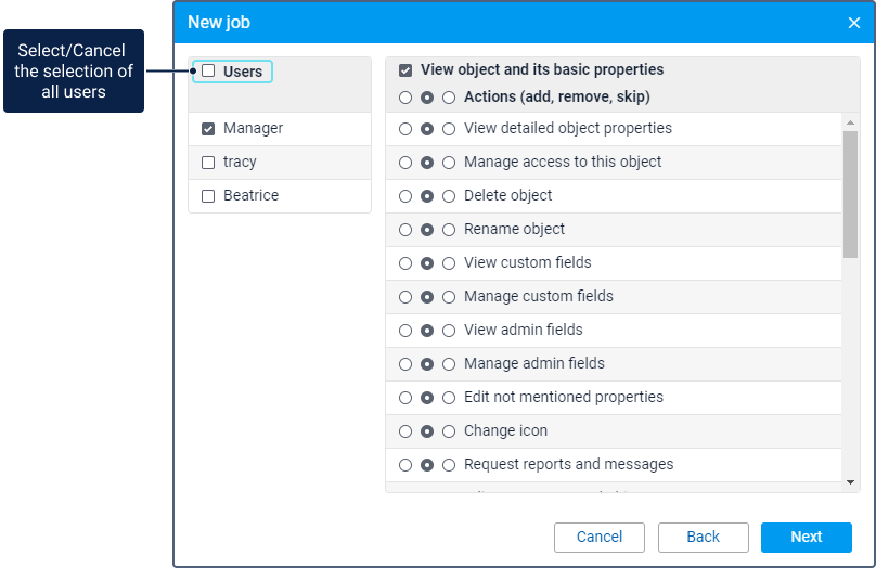To create a job of this type, follow the guide to creating jobs. In step 4, select the users and select a new set of rights for them as follows: