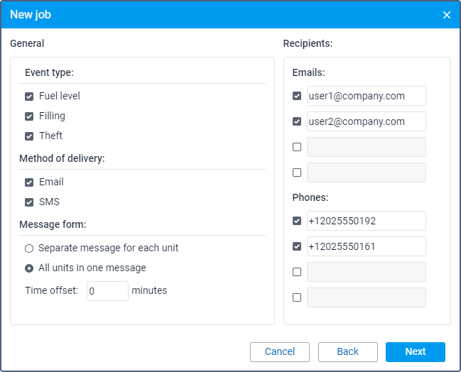 A job of this type allows you to receive information about fuel thefts, fillings and fuel level by email or in SMS messages.