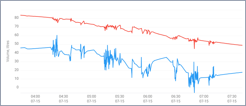 Below are two fuel level charts: the first one is processed (time-based FLS and filtration are on, the filtration level is 3), and the second one is not processed.