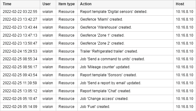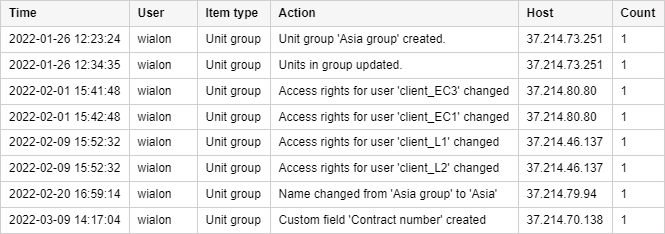 A report with the Log table can be executed for units, unit groups, users, resources, retranslators, and routes. This table contains records about changes made by users in the properties of the object or its contents. Unlike the log of the monitoring or management system, the report doesn’t show records about errors, receiving messages from a unit, etc.