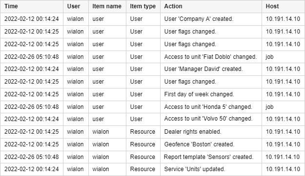 | Item type | The type of the object the properties or contents of which were changed. Possible types: unit, unit group, user, resource, retranslator, or route. |