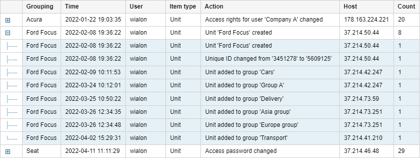 In the settings of the Log table for a unit group, the Group itself option is available. If it is disabled, the log shows changes for individual units that are part of the group or groups. To execute such a report, you should activate the Detalization option.