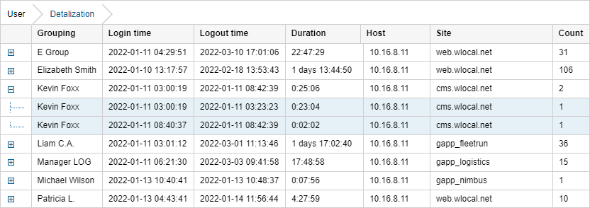 To the Logins table, you can apply such settings as grouping, sorting, detalization, row numbering, the Total row, time limitation. By default, the data in the table is grouped by user.