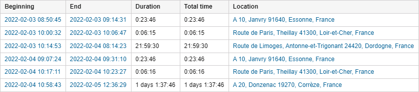 | Coordinates | The coordinates of the unit during the parking (in decimal degrees). |