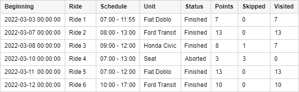 | Status | Finished (the route was successfully activated, and the entrance to the last point was subsequently recorded), Not finished (the last point was not visited) or Aborted (the ride has been removed from the table manually or its expiration time has been reached). |