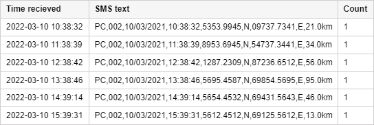 In this report, you can view all SMS messages received from a unit in a specified period. The report can contain the columns described below.