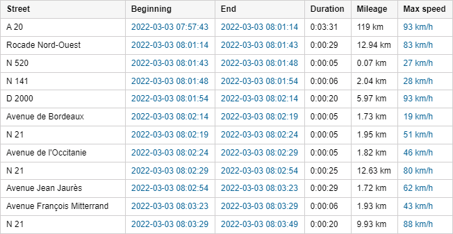 | Max speed | The maximum speed detected while moving along the street. More information about speed in reports can be found here. |