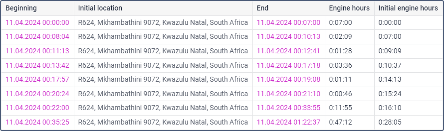 | Total time | The time from the start to the end of engine hours interval. It is recommended to use this column in combination with the grouping parameter or the Total row. If the Total row is configured in the table, it shows all the time that elapsed from the start of the first engine hours interval to the end of the last one. |