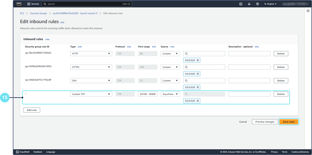Edit the rules for incoming traffic (the Inbound rules section). Add a rule with ports 20 100–30 000 for the hardware.