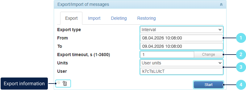 - In the Export timeout field, specify the timeout duration between the exports of messages from different units if there are several of them. The timeout allows avoiding the system overload. To save the specified value, click Change .