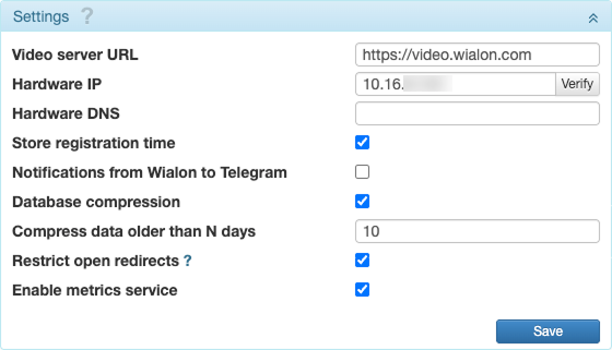 | Hardware DNS | The domain name of the server to which the data from the units should be sent. It is displayed in the properties of all units in the Server address field. |