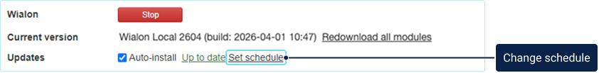 | Current version | The current version of Wialon Local is specified here. In case the modules work incorrectly, you can reinstall them. To do this, click Redownload all modules next to the version of Wialon Local and install the downloaded update. |